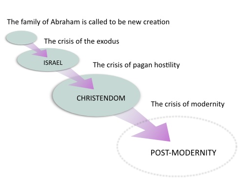 To help refocus the question, therefore, I propose the following schematic and greatly over-simplified account of the symbolic function of the relationship between the people of God and the “land”. It tracks the paradigmatic nature of the people as a sociological entity embodying new creation as it is reformed after each crisis. The exile is excluded only because, although traumatic, it led to a reaffirmation of the national paradigm. The schema leads to a question: What sociological form does new creation take under the conditions of post-imperialism and post-modernity?