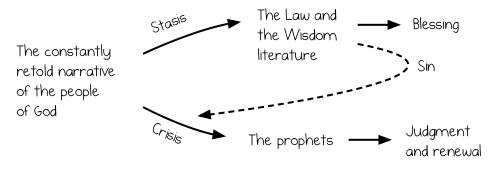 Life on the road—or perhaps in exile—is very different to life at home; living out of a suitcase is very different to living out of a wardrobe and chest of drawers and bathroom cabinet; and what the people of God needs to learn varies accordingly. The constantly retold narrative of the Old Testament enabled Israel to locate itself in the world, in relation to the nations, as God’s people. But then, roughly speaking, the Law and the Wisdom literature taught Israel how to live well in the land; and the Prophets taught Israel how to respond to the crises brought upon the nation by their failure to live well in the land.