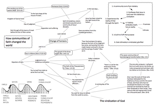 My argument, basically, was that what we get in the New Testament is not a universal or standard or timeless definition of what church should be and do. What we get is an account of how communities were called to bear faithful witness to God's future under the particular historical conditions of eschatological crisis—first in Israel itself, then throughout the Greek-Roman world. In other words, the churches of the New Testament understood themselves to be engaged in a narrative, which had a past, a present, and most importantly a future. They had a thoroughly apocalyptic outlook. The western church has no sense of being part of a narrative, other than the annual cyclical narrative of Christmas, Easter and Pentecost, which goes nowhere. We go from week to week, sermon series to sermon series, year to year, but there is no big, engrossing, inspiring, shaping narrative.