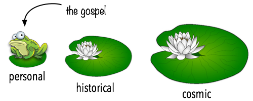 So I maintain, both for reasons of biblical interpretation and for the sake of the integrity and mission of the post-Christendom church, that we need to put the frog of the gospel back on the mid-size lily pad of the historical narrative.