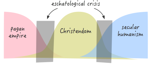 My sense is that we are currently going through a protracted “eschatological” crisis comparable to the crisis faced by the early church, as the second temple Jewish world fell apart and a quite vicious pagan imperialism fought back against a movement that was convinced that God had given the nations to his Son as his heritage, the ends of the earth as his possession (cf. Ps. 2:7-9). Only, we are on the other side of the Christendom bell-curve, on a downward rather than upward trajectory.