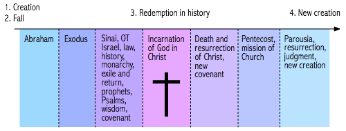 I pointed out last week that in the standard “redemption in history” construal of the biblical narrative—as represented, for example, by Chris Wright’s The Mission of God’s People: A Biblical Theology of the Church’s Mission—all the history is found before Jesus. Nothing of significance happens between Pentecost and new creation. Perhaps this defect is repaired elsewhere in the book, you may wonder. Sadly not. The only chapter that sheds any further light on how Wright understands the narrative after Jesus is chapter 11: “People who proclaim the gospel of Christ”; and what we find here is fully consistent with the diagram.