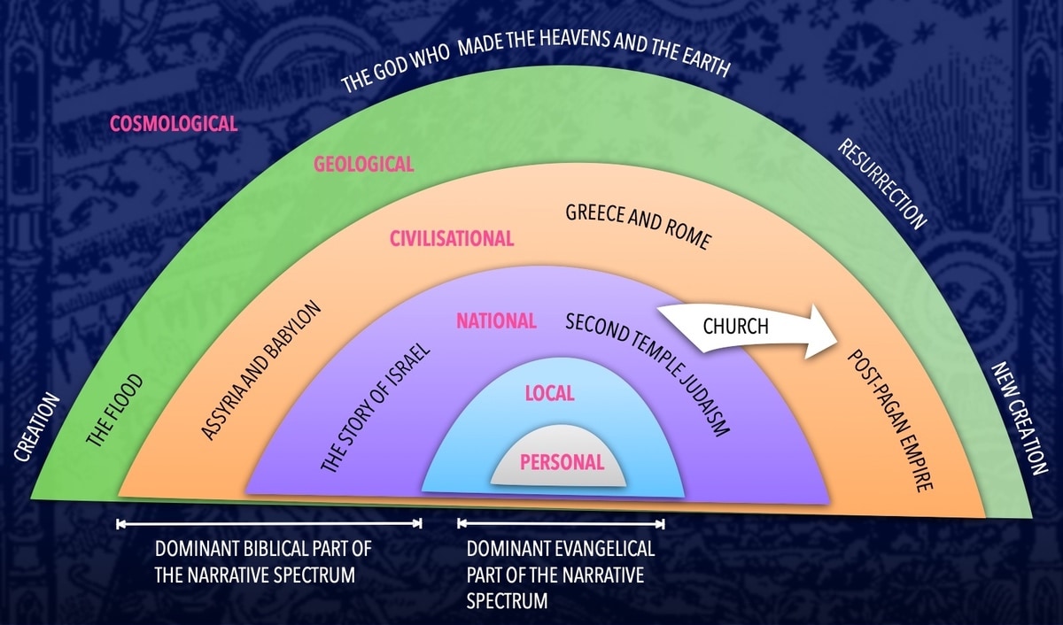 What makes the Bible so remarkable is the sheer historical comprehensiveness—the depth and complexity—of its account of what it meant for an ancient people to pursue a unique priestly vocation over a long period of time. The graphic shows the six narrative levels, revolving in time from left to right: cosmological, geological, civilisational, national, local, and personal.