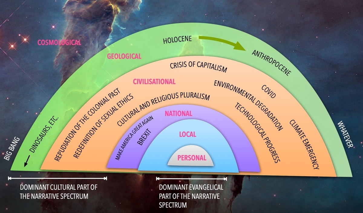 Modern evangelical theologies mostly eschew the national, civilisational, and geological layers of theological storytelling. The alignment of American evangelicalism with the nationalist agenda of the political right is the obvious exception—that and the lingering fundamentalist commitment to a literal creation account. But otherwise, the focus is on the personal story, embracing family and local church community, against a backdrop of creation, fall, cosmic redemption, final judgment, and new creation.